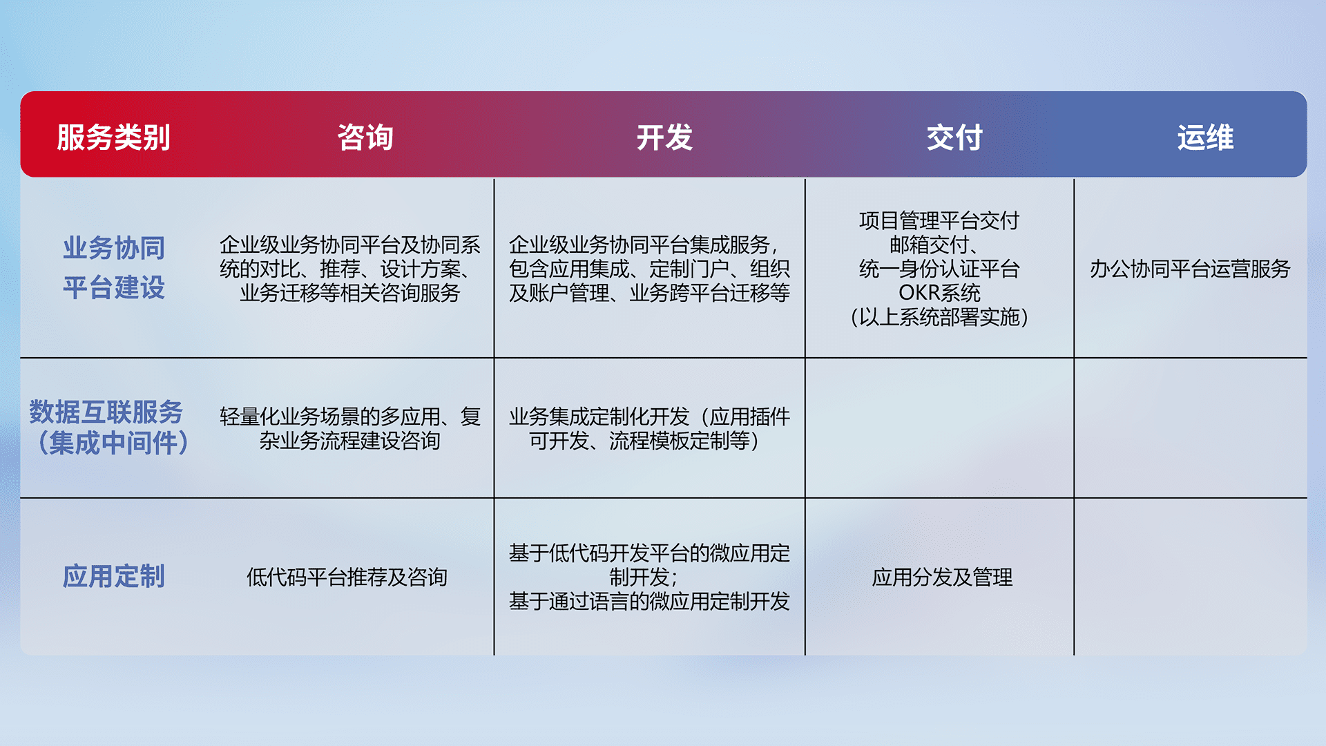 针对钉钉、、、、企微、、IDaas等平台级产品提供产品的规划、、、方案、、交付、、、、定制化开发等服务,,,,实现如统一协同办公、、智能客户服务、、、混合会议管理、、、智能数据查询、、、等业务场景,,,实现数字化转型。。。