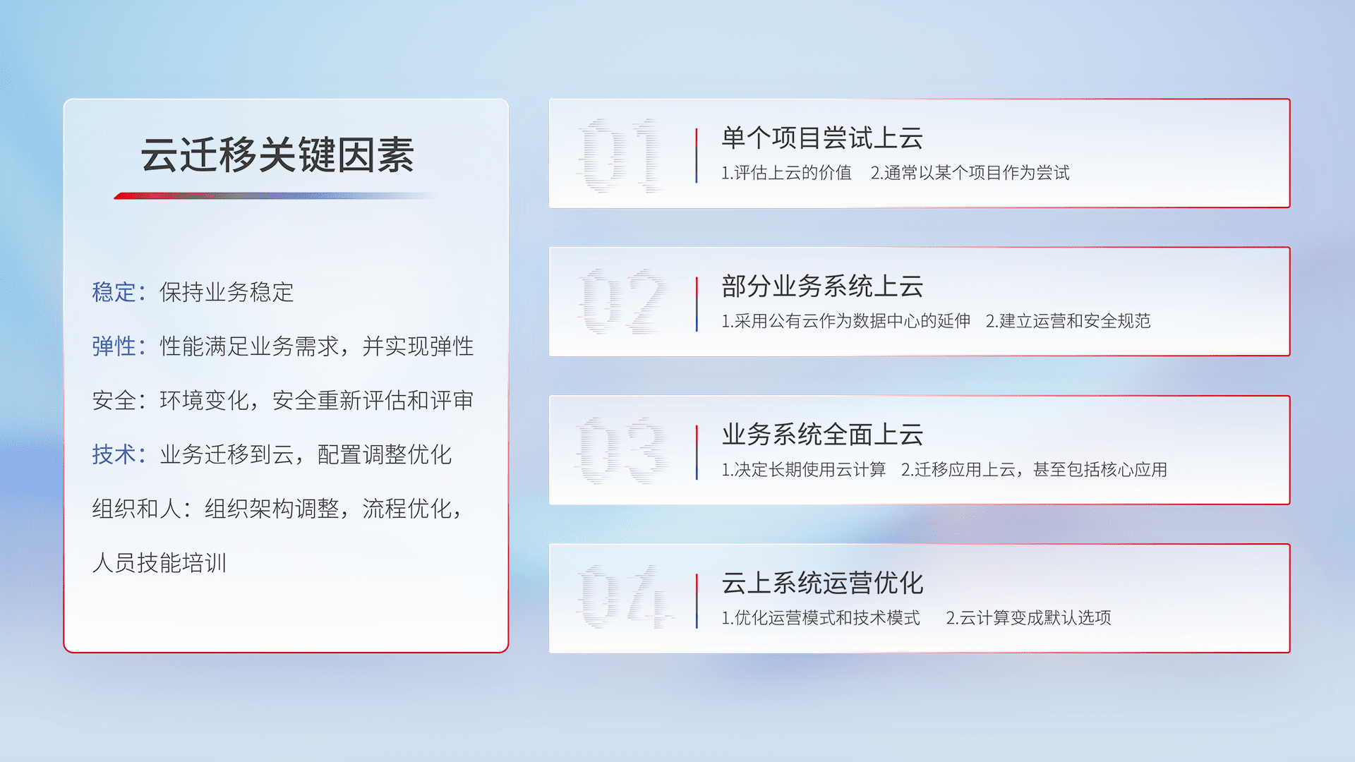 结合实际业务,,,从规划设计、、、云平台选型、、、、云原生改造、、数据迁移、、、、集成交付,,迁移全过程为客户识别最佳上云路径,,,,做好风险识别管理,,设计网络架构、、、身份权限、、安全审计合规、、、、操作审计、、日志审计、、、监控告警策略、、、、多站点容灾设计等,,,,对云上基础设施进行整体规划,,,提升IT治理水平,,以满足弹性、、、高可用、、、高性能的需求。。。